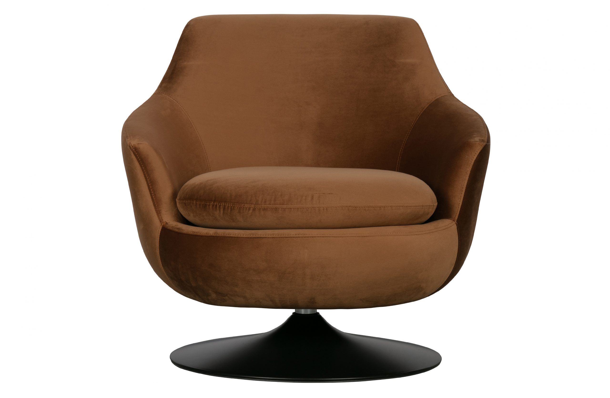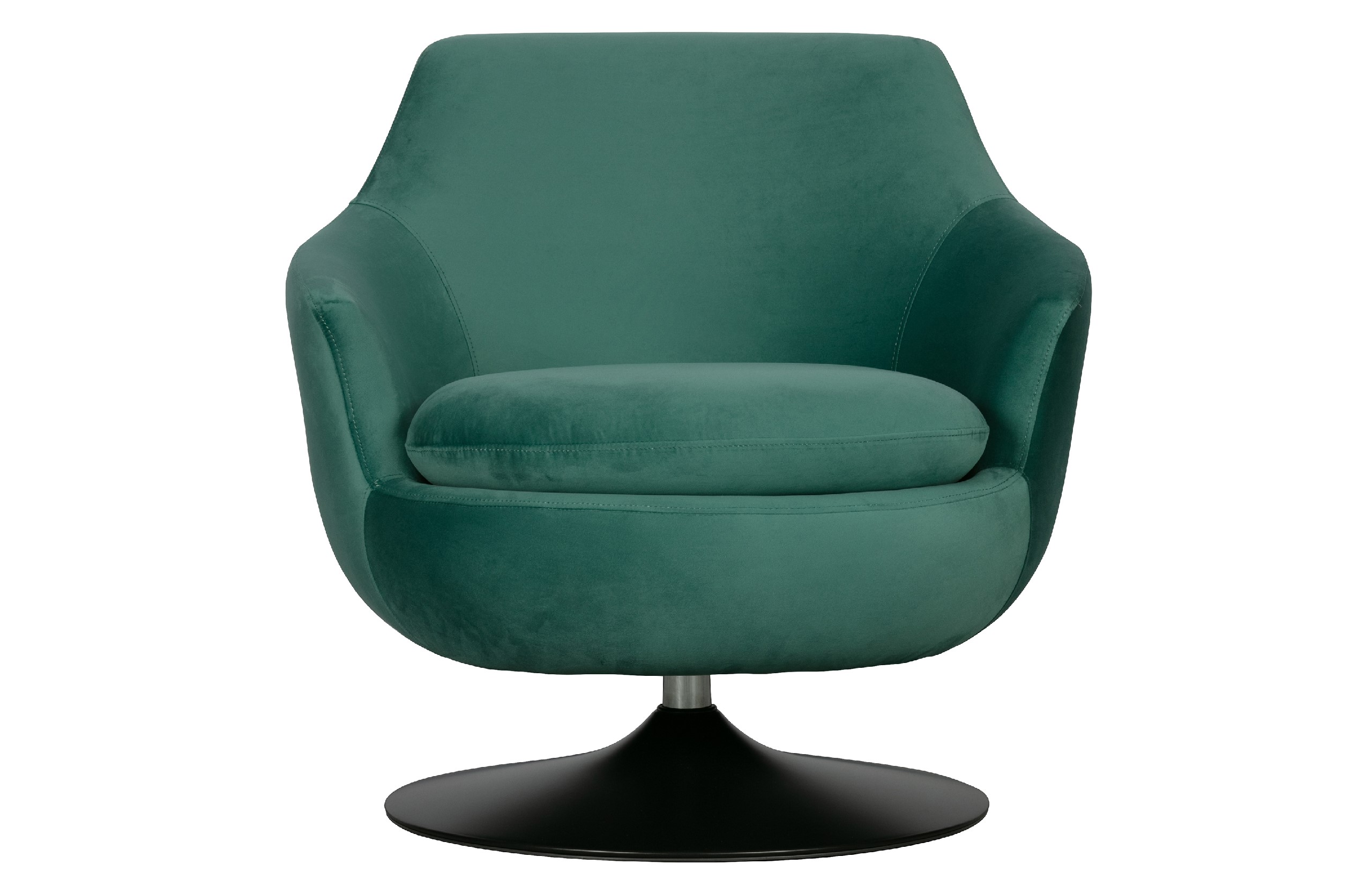 Swivel armchair made of velvet polyester fabric in 2 shades (brown, petrol) with metal base.
